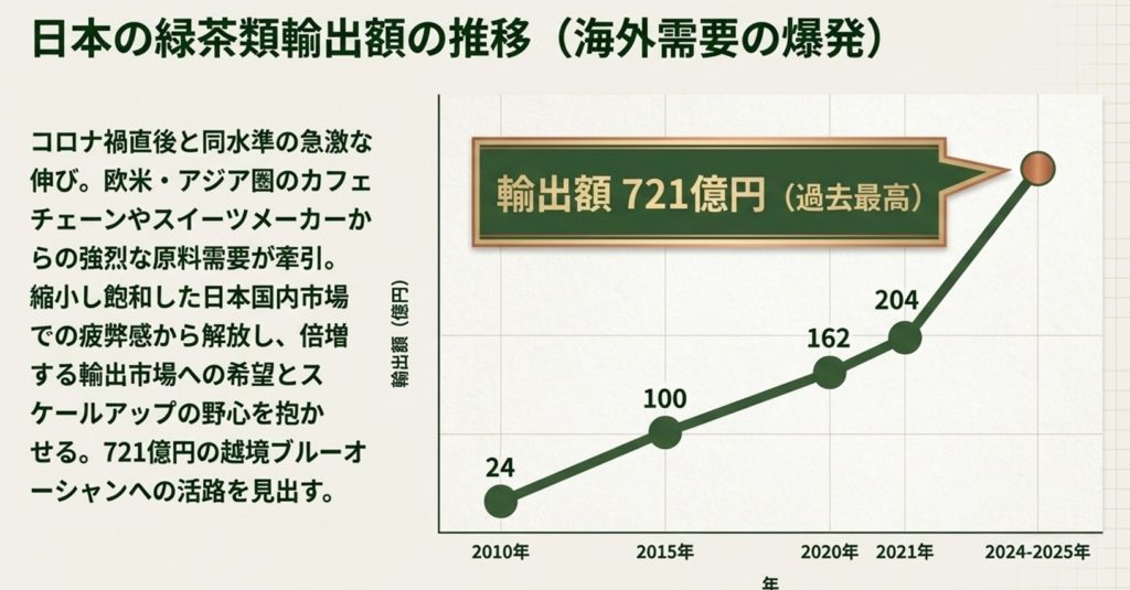この数字は、抹茶が日本企業にとって大きなポテンシャルを持つ越境市場であることを如実に示しています。